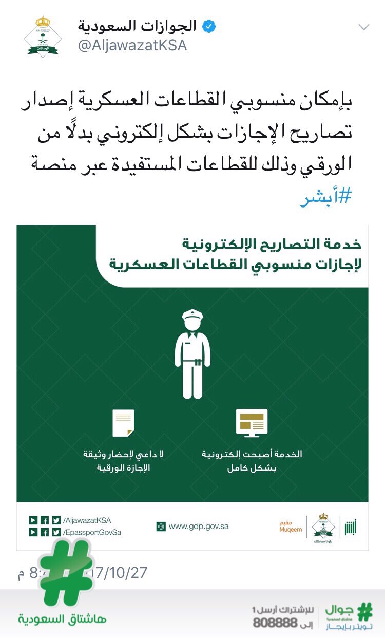 هاشتاق السعودية On Twitter الجوازات تتيح لمنسوبي القطاعات العسكرية إصدار تصاريح الإجازات بشكل إلكتروني بدل ا من الورقي وذلك للقطاعات المستفيدة عبر منصة أبشر Https T Co Wckhgsqigw