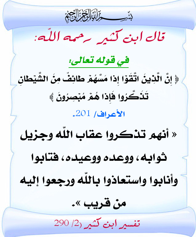 إ ن ال ذ ين ات ق و ا إ ذ ا م س ه م ط ائ ف م ن الش ي ط ان ت ذ ك ر وا ف إ ذ ا ه م م ب ص ر ون تفسير ابن كثير الأعراف 201