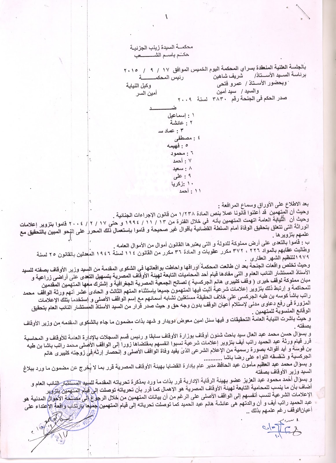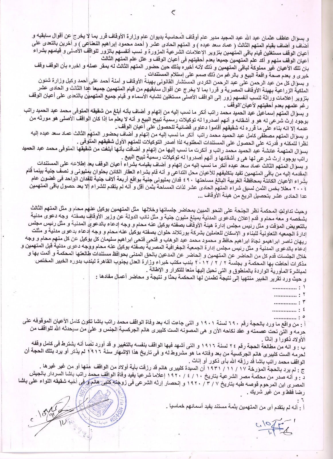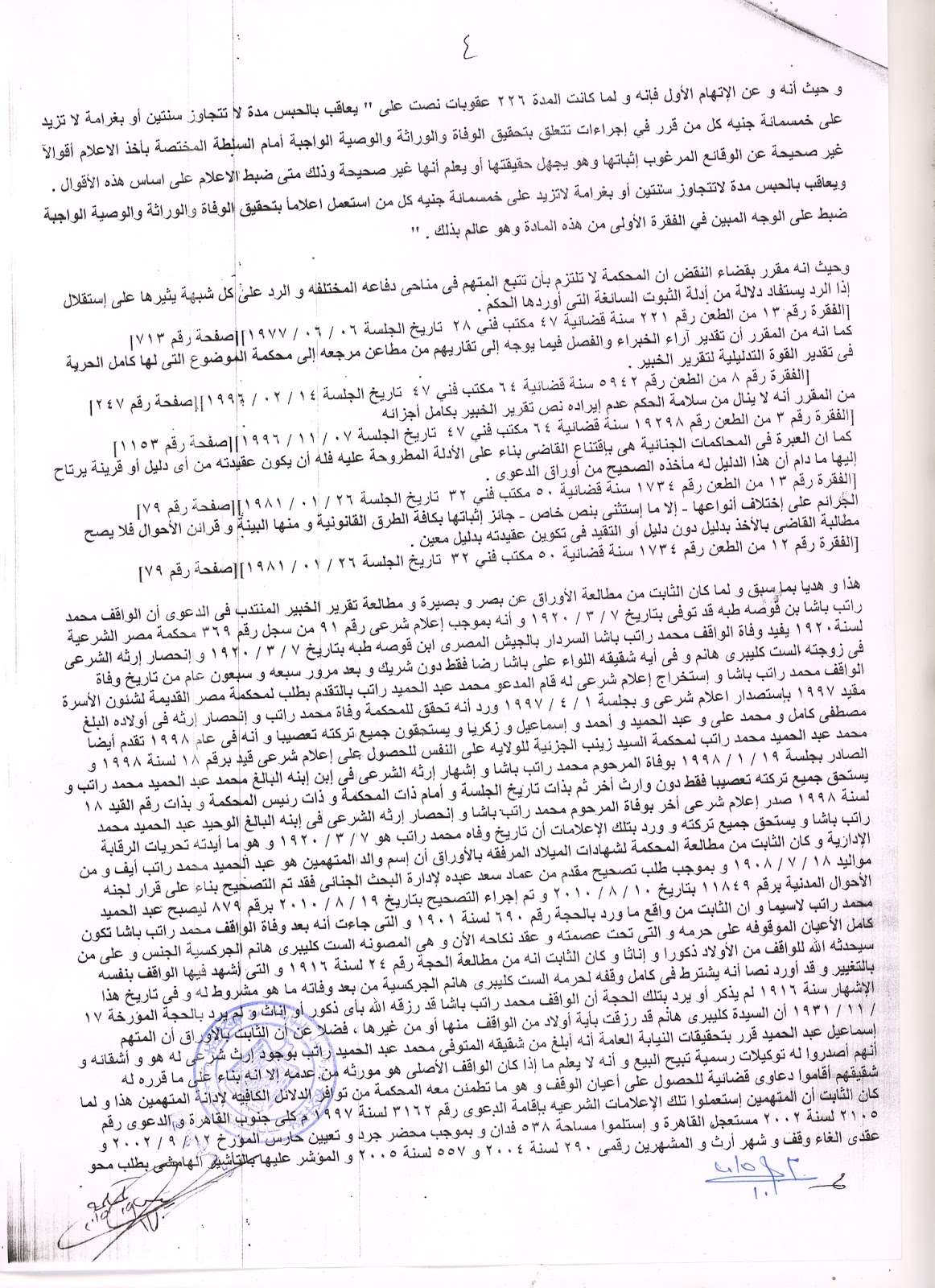 الم دونة القانونية للأستاذ أشرف رشوان المحامي بالنقض والدستورية العليا مذكرة دفاع في جنحة تزوير في مستند رسمي تزوير إعلام وراثة الواقف عبد الحميد راتب باشا وصورة الحكم الصادر في الجنحة