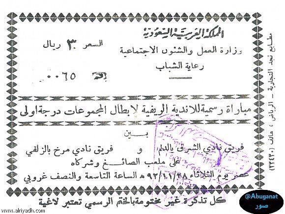 عبدالله الراجحي On Twitter تذكرة قديمة مباراة بين نادي الشرق بالدلم ونادي مرخ بالزلفي بتاريخ ١٣٩٢ ١١ ٢٨ الساعة ٩ ونص غروبي سعر التذكرة ٣ريال Https T Co Es6xaojesw