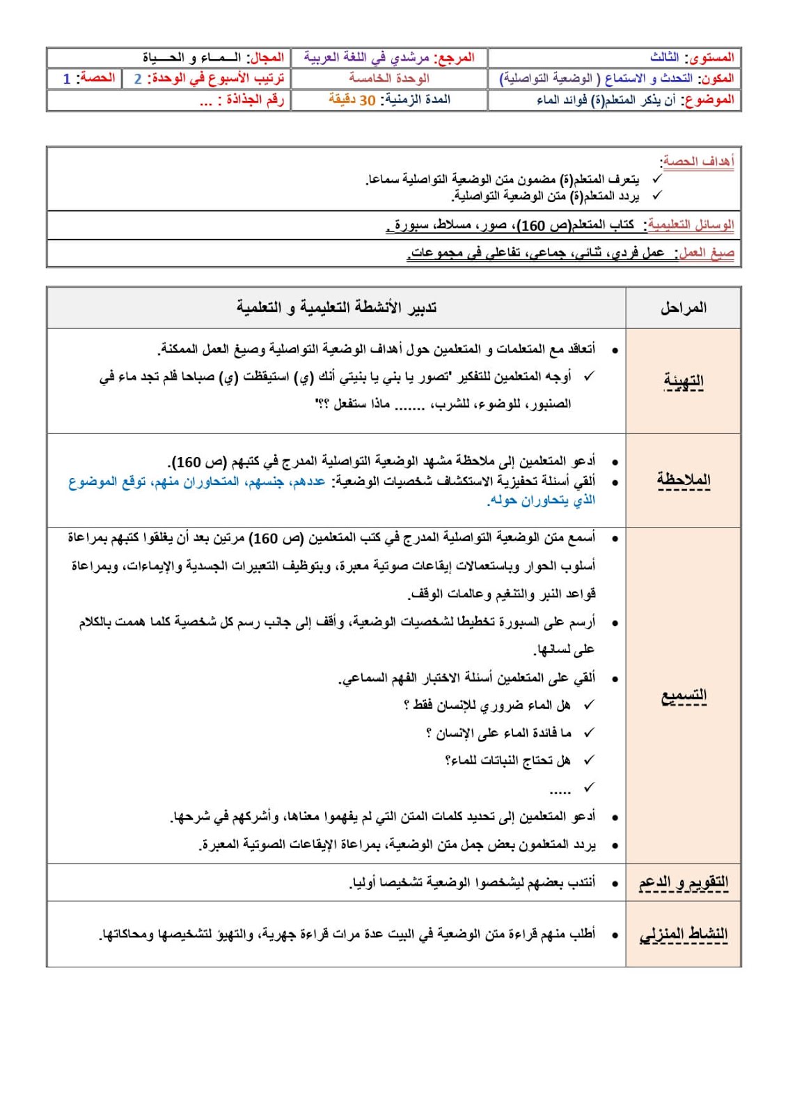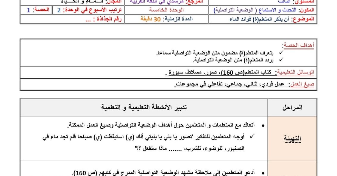 جذاذة الوضعية التواصلية أن يذكر المتعلم فوائد الماء للمستوى الثالث