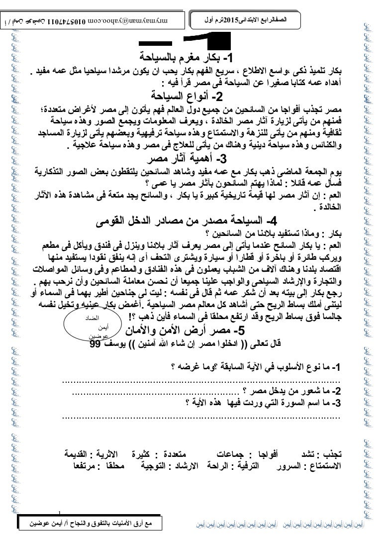 مذكرة أيمن عوضين فى لغة عربية للصف الرابع الإبتدائى ترم أول2015